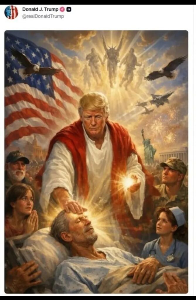 La publicación apareció en su cuenta de Truth Social y mostraba al exmandatario con túnica blanca realizando un gesto de sanación, rodeado de símbolos como la bandera de Estados Unidos y la Estatua de la Libertad. La imagen, aparentemente creada con inteligencia artificial, permaneció en línea por más de 12 horas.
